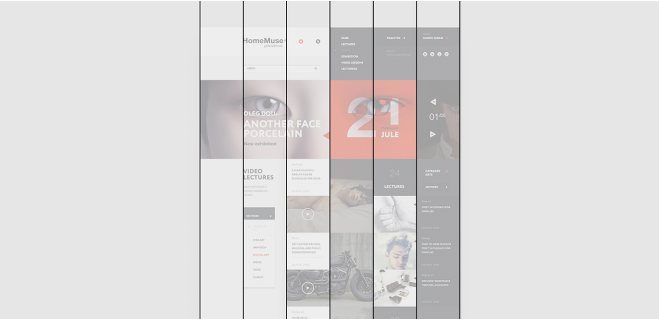 Модульная сетка, наверное, лучший инструмент для деления пространства в интерфейсе, поскольку это как таблица, всё по полочкам, ничто никуда не летит.Количество рядов в модульных сетках определяется форматом и количеством информации. Чем больше количество рядов, тем более детальная получается сетка. С такой сеткой сложнее работать, но интереснее.